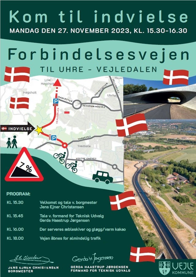 Vejle Kommune inviterer til indvielse af et af deres største anlægsprojekter, forbindelsesvejen vest om Uhre, den 27. november 2023 kl. 15.30.